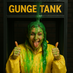 More pies now, then another bucket of gunge over the head, with some more gunge poured down inside the clown suit. Feeling so silly now, he puts the bucket on his head! Then he does even more pies, including a gunge and cream pie, slapped straight onto his colourful ass--and the cream splats all over the place. He has a bit of a roll and rub around in the slop in the bottom of the pool, as he enjoys getting covered so badly.