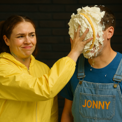"Big dick clowning fun, with spray cream, green gunge, and a Giant foam pie!"